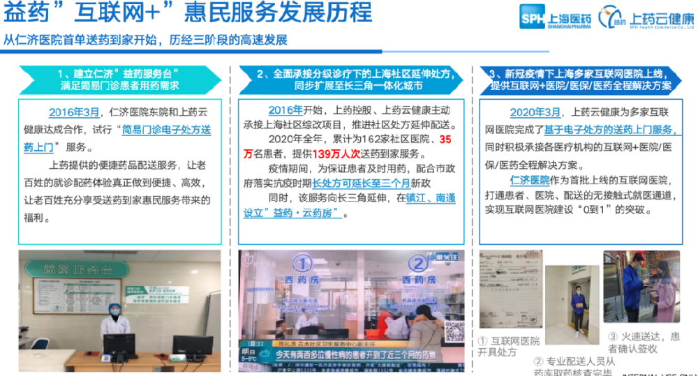 2020年,上藥云健康累計為162家社區(qū)醫(yī)院、35萬名患者,提供139萬人次送藥到家服務。在疫情期間,為保證患者及時有藥可用,上藥云健康和仁濟醫(yī)院配合市政府落實抗疫時期“長處方可延長至三個月”新政。同時,該服務逐步向長三角地區(qū)延伸,分別在鎮(zhèn)江、南通等地設立”益藥·云藥房”。