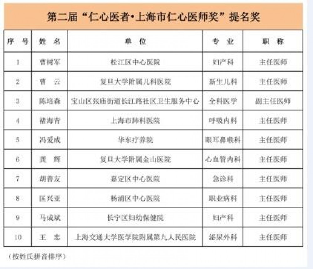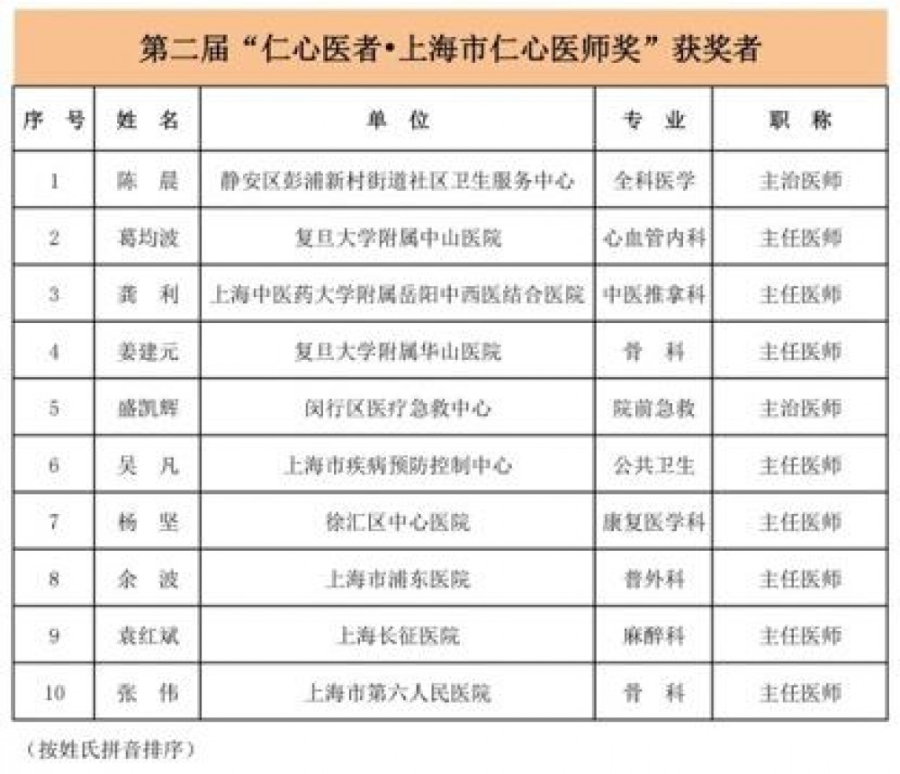 本次評(píng)選活動(dòng)由上海市衛(wèi)生和計(jì)劃生育委員會(huì)指導(dǎo),上海市醫(yī)師協(xié)會(huì)、上海市浦東新區(qū)廣播電視臺(tái)共同主辦,上藥控股有限公司獨(dú)家支持,于2017年2月啟動(dòng)、5月舉辦了初審活動(dòng)。本屆獲獎(jiǎng)醫(yī)師名單如下: